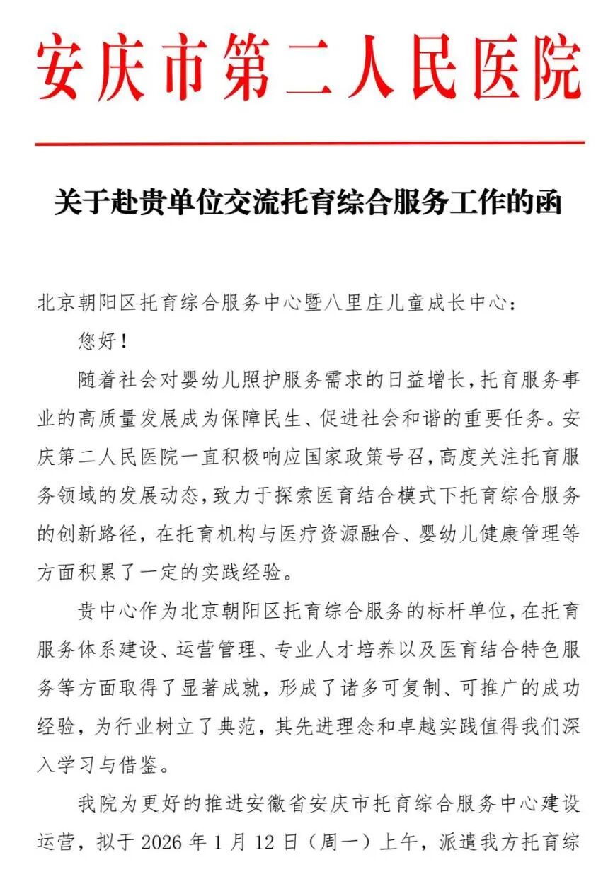 近日,安庆市第二人民医院联合贝乐集团董事长周典静率核心管理团队赴北京,与朝阳区托育综合服务中心暨八里庄儿童成长中心、海淀区托育综合服务中心展开深度交流,聚焦医育结合模式创新与托育服务品质提升。